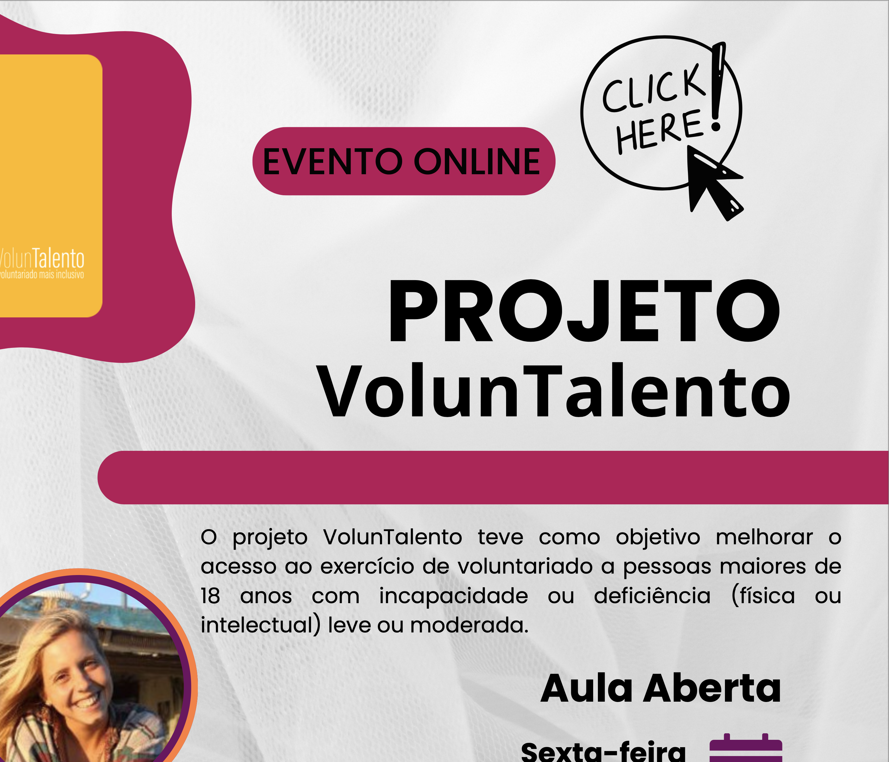Em particular, nesta aula aberta irá abordar o projeto VolunTalento que teve como objetivo melhorar o acesso ao exercício de voluntariado a pessoas maiores de 18 anos com incapacidade ou deficiência (física ou intelectual) leve ou moderada.